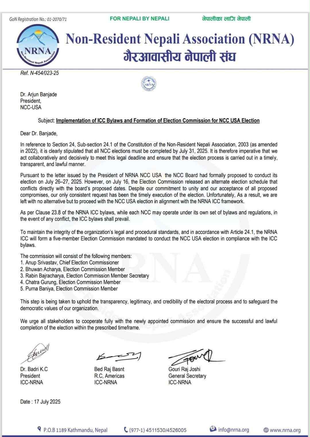 गैरआवासीय नेपाली संघ (एनआरएनए) अमेरिकामा आगामी जुलाईभित्रै निर्वाचन सम्पन्न गर्ने बाटो खुलेको छ।