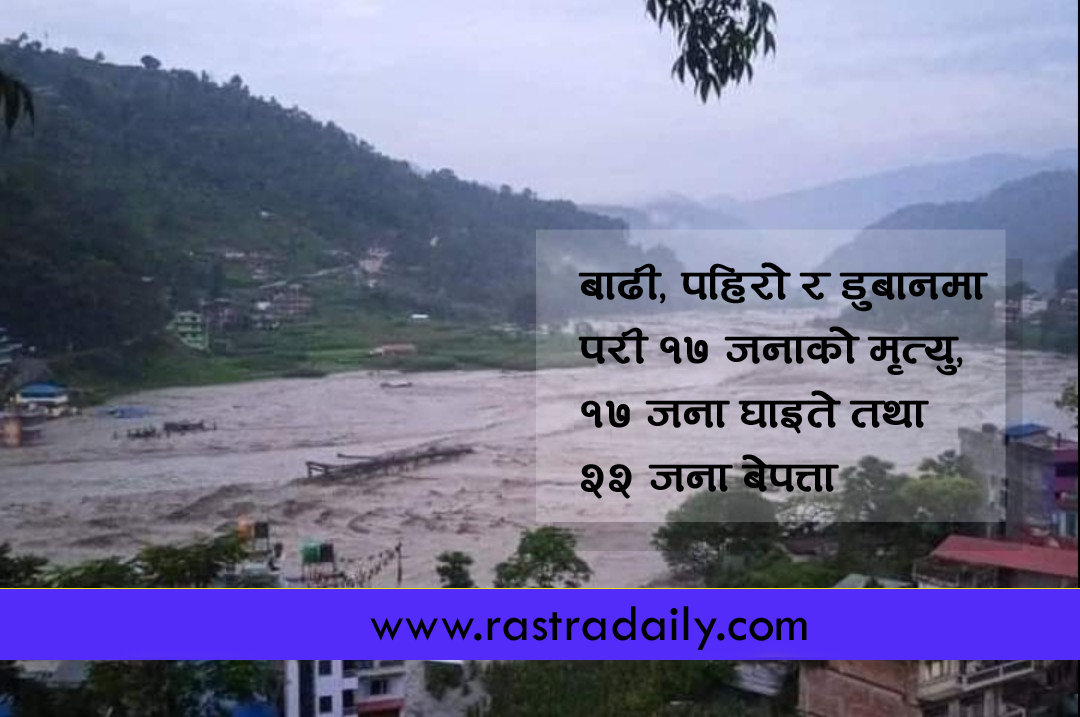 बाढी, पहिरो र डुबानमा परी १७ जनाको मृत्यु, १७ जना घाइते, २२ जना बेपत्ता