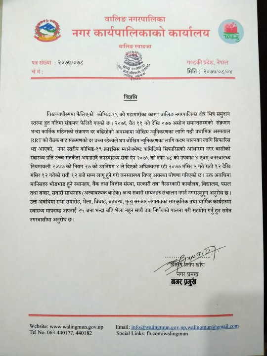 वालिङमा एक हप्ताका लागि अत्यावश्यक बाहेक सम्पूर्ण सेवाहरु बन्द