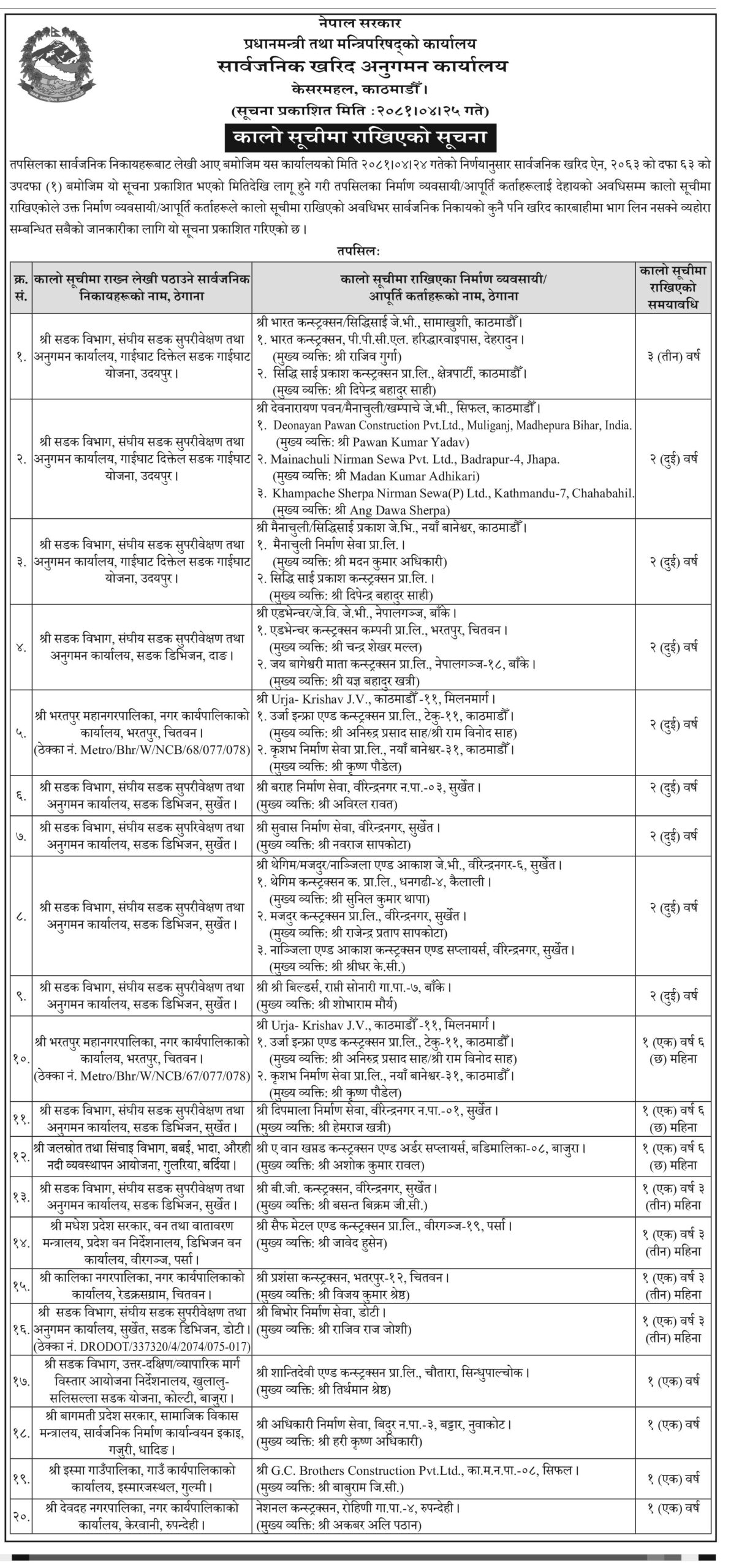 शुक्रबार प्रकाशित एक सूचनाअनुसार कालोसूचीमा राखिएका उक्त निर्माण कम्पनी तथा व्यवसायीहरुले कालोसूचीमा राखिएको अवधिभर कुनै पनि खरिद काराबाहीमा सहभागी हुन नपाउने उल्लेख छ । कार्यालयका अनुसार कालोसूची १ देखि ३ वर्षसम्मका लागि राखिएको छ ।