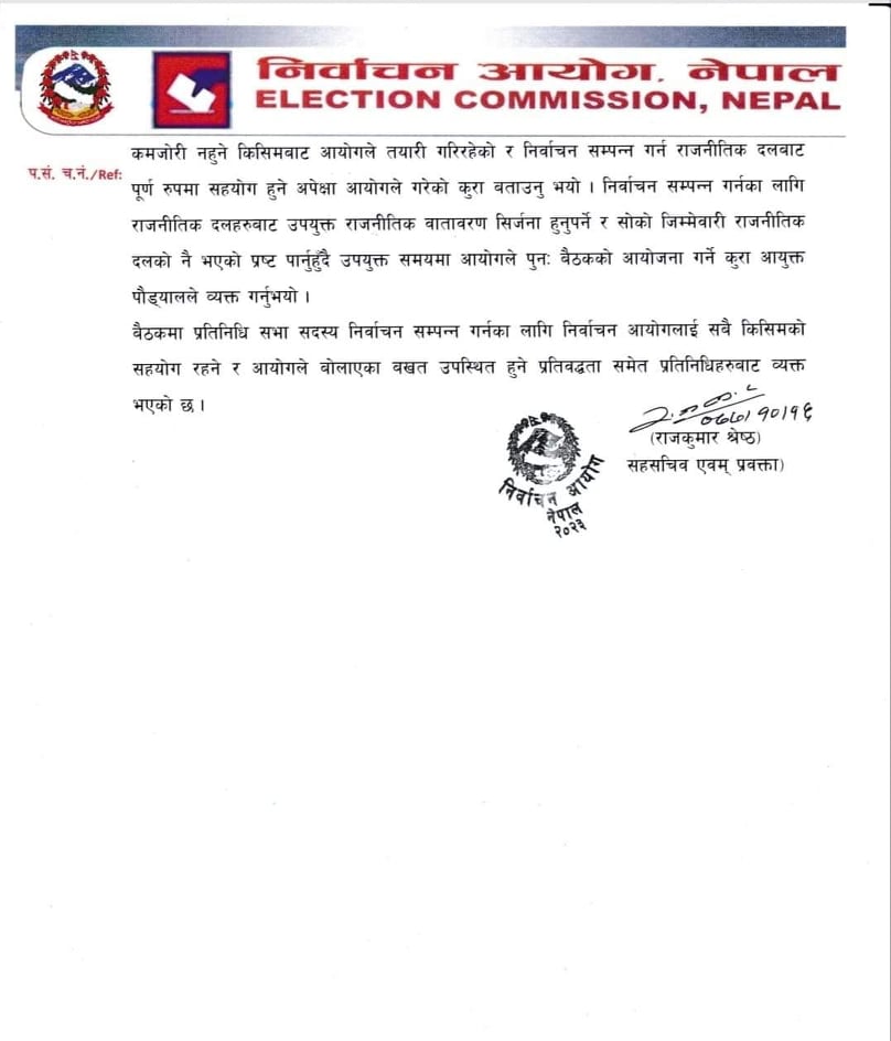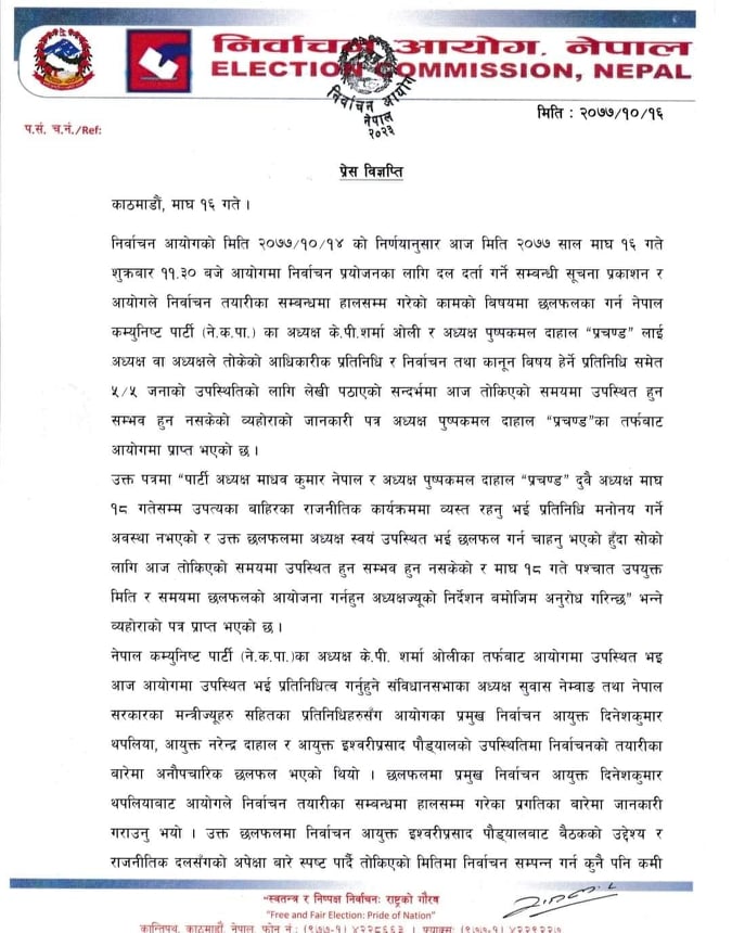 शुक्रबार ओली पक्षीय नेताहरुसँग कुरा गरेपछि आयुक्त ईश्वरीप्रसाद पौड्यालले आधिकारिकता दाबी गर्न कुनै पक्ष नआएकोसमेत बताए ।