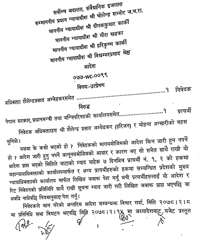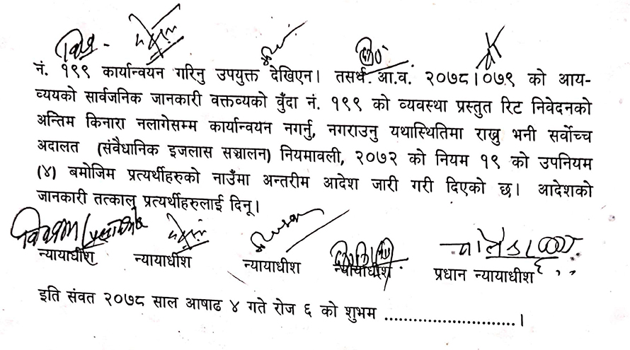 प्रधानन्यायाधीश चोलेन्द्र शम्शेर जबरा, न्यायाधीशहरु दीपककुमार कार्की, मीरा खड्का, हरिकृष्ण कार्की र विश्वम्भरप्रसाद श्रेष्ठको इजलासले बजेट बक्तव्यको बुँदा नम्बर १९९ तत्काल कार्यान्वयन नगर्न अन्तरिम आदेश दिएको हो ।