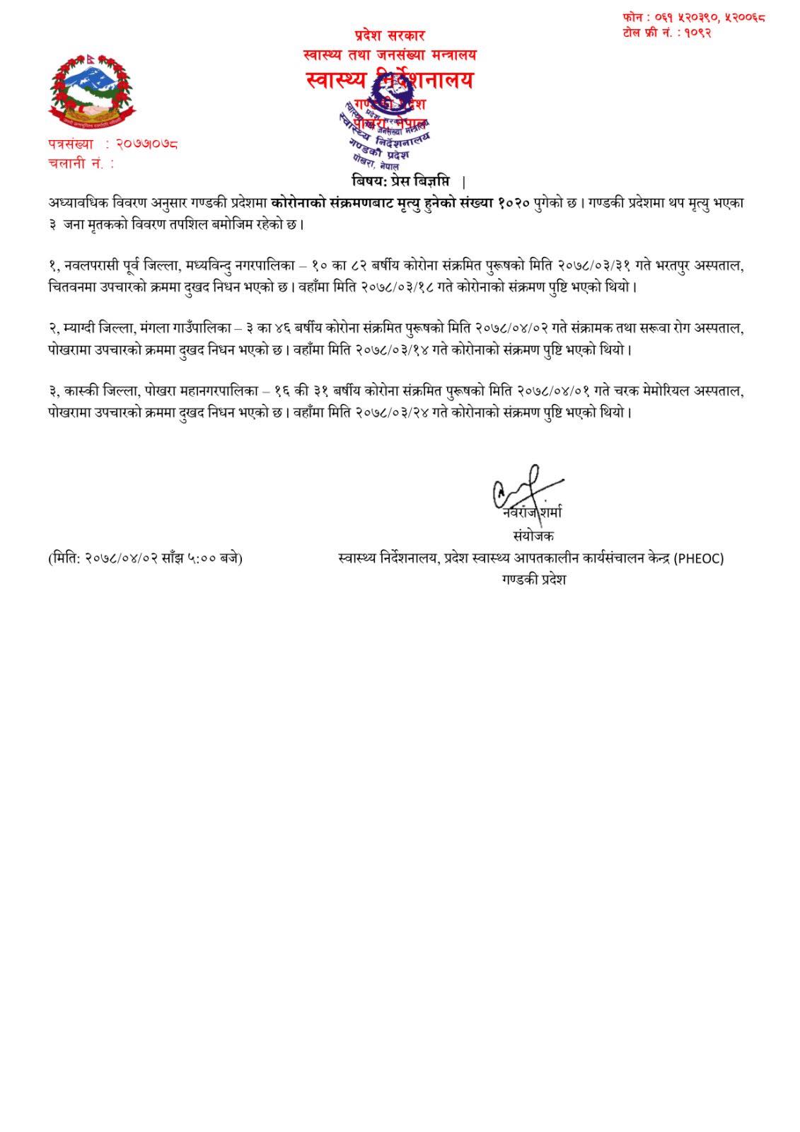 आज मृत्युहुनेमा नवलपुर जिल्ला मध्यविन्दु नगरपालिका १० का एक जना, म्याग्दी मंगला गाउँपालिका ३ का एक जना र कास्कि पोखरा -१६ निवासी ३१ वर्षीय पुरुष छन् ।