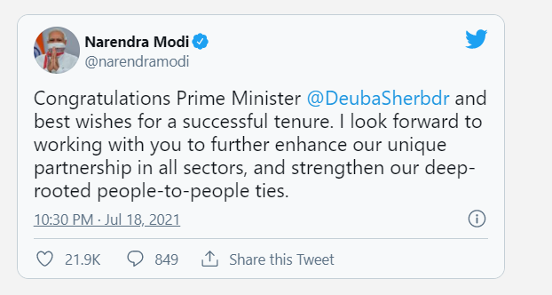 मोदीले आइतबार राति ट्वीटमार्फत बधाई दिँदै प्रधानमन्त्री देउवाको सफल कार्यकालको शुभकामना व्यक्त गर्नुभएको छ ।