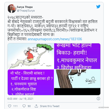 सामाजिक सञ्चाल ट्वीटरमा ट्वीट गर्दै थापाले भनेका छन्,’ २०७८ साउन ३ को मध्यरात- श्री शेबदे नेतृत्वको टालाटुली बटुली सरकारले विश्वासको मत हासिल गर्यो । काङ्ग्रेस ६१, माके ४९, जसपा३२, हरामी गुट२२ र राष्ट्रिय जनमोर्चा१= १६५ । विपक्षमा एमाले८३, विरामी१०, फ्लोक्रस, प्रलोभन र बिक्रीबट्टा त परमादेशबाटै मान्य छ ! हेरौँ त तमासा !’
