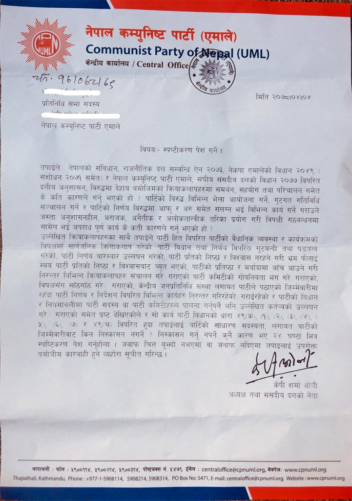 साउन ४ गतेको मिति राखेर पठाइएको पत्रमा पार्टीको हितविपरित विभिन्न भेला गरेको, गुटगत गतिविधि संचालन गरेको उल्लेख गरिएको छ । पत्रमा चित्त बुझ्दो जवाफ नआए थप कारवाही समेत गरिने उल्लेख गरिएको छ ।