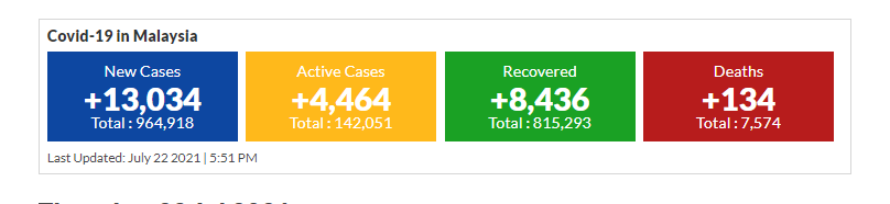 मलेसियामा कोरोना दिनप्रतिदिन वढिरहेको छ । यसैक्रममा आज मात्रै १३ हजार ३४ जना नयाँ सक्रमित थपिएका छन । यो सगै मलेसियामा ९ लाख ६४ हजार ९ सय १८ जना सक्रमित भैसकेका छन ।