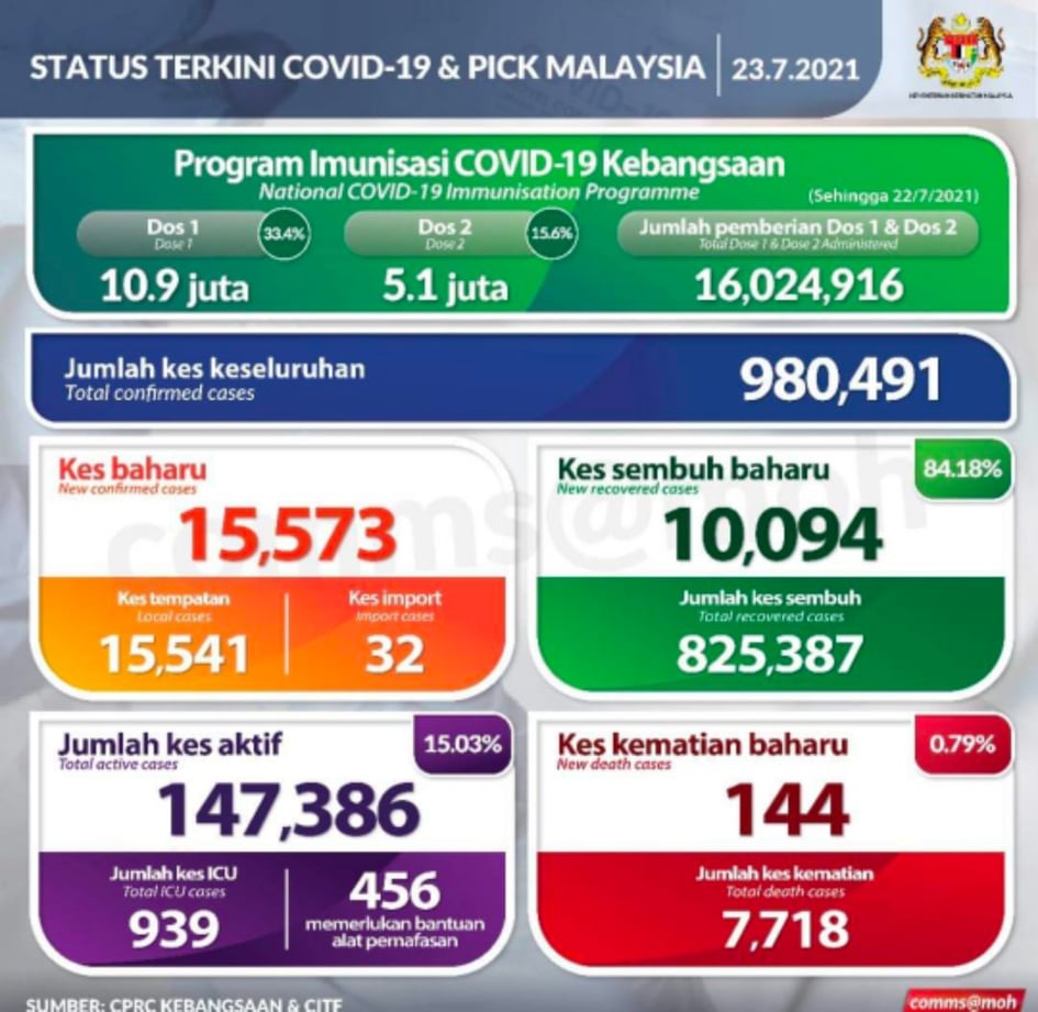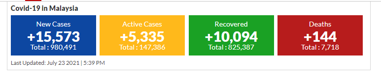 मलेसियामा आज १५ हजार ५ सय ७३ जना नयाँ कोरोनाका सक्रमित थपिएका छन ।