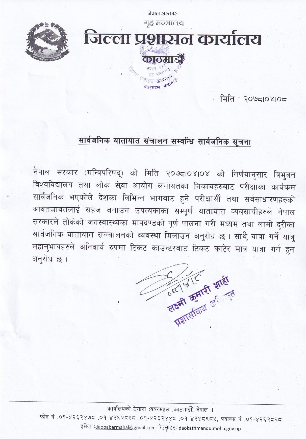 काठमाडौं जिल्ला प्रशासन कार्यालयले सूचना प्रकाशित गरी स्वास्थ्य मापदण्ड पालना गर्न अनुरोध गरेको छ। साथै लामो दूरीका सवारी साधनका लागि काउन्टरबाट मात्रै टिकट काट्न सचेत गराएको छ।