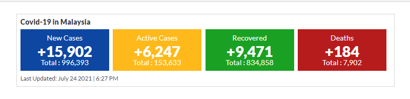 मलेसियामा आज १५ हजार ९सय २ जना नयाँ कोरोनाका सक्रमित थपिएका छन ।