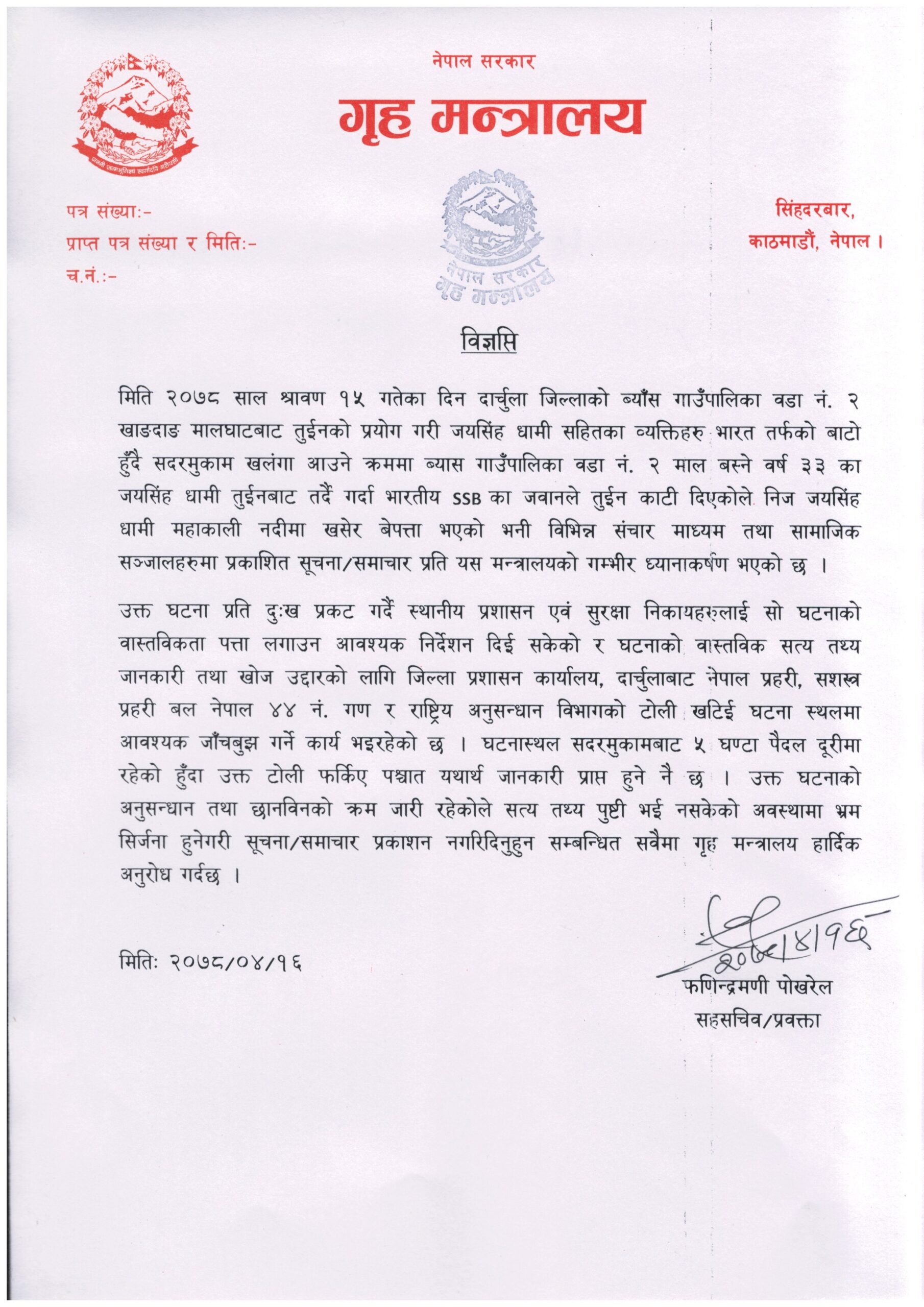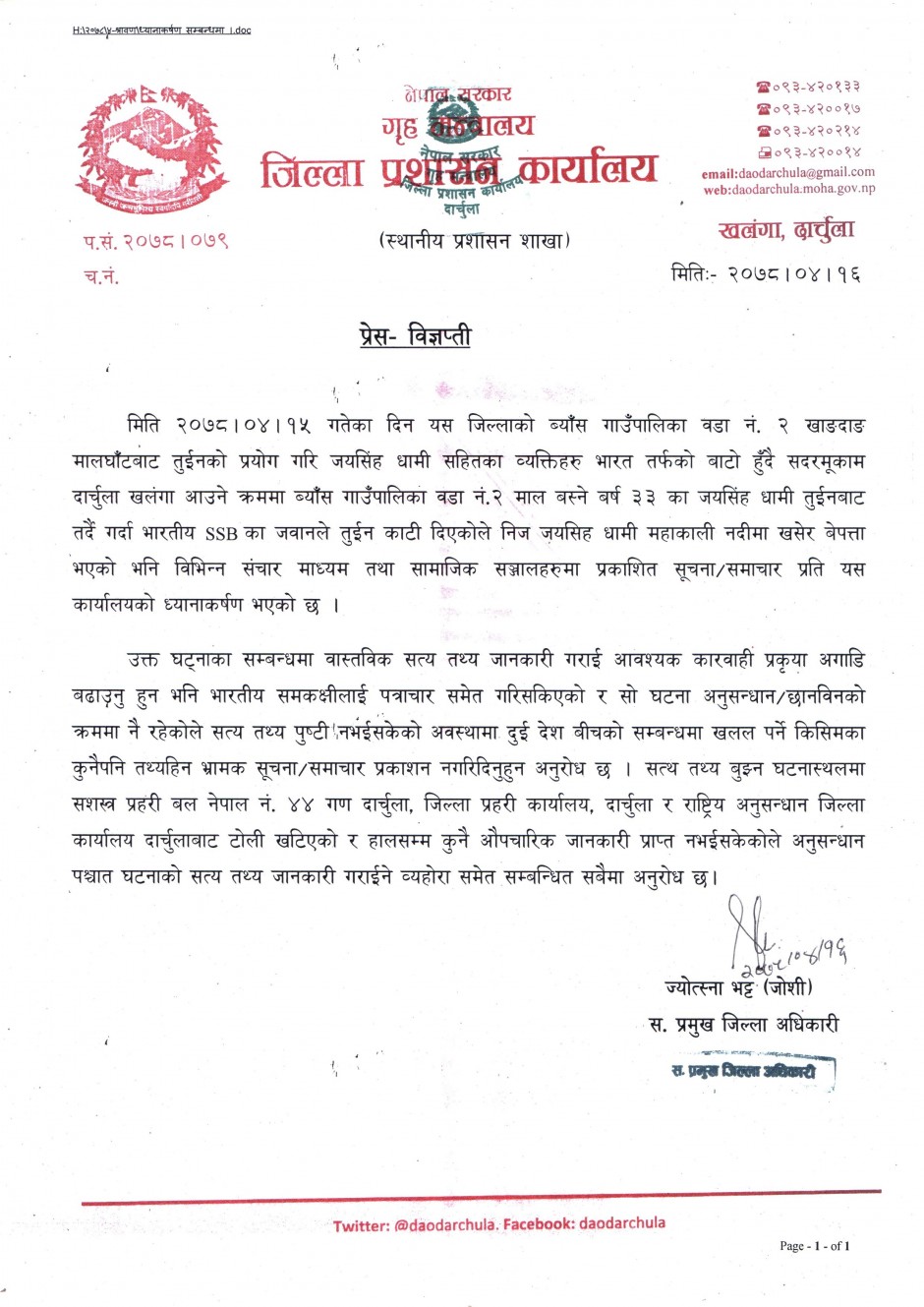 जिल्ला प्रशासन कार्यालय दार्चुलाले घटनाबारे पत्राचार गरेपछि भारतको पिथौरागढका जिल्ला अधिकारी आनन्द स्वरुपले शनिबार दार्चुुलाका प्रमुख जिल्ला अधिकारी सिद्धराज जोशीलाई जबाफ पठाएका हुन्।
