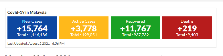 मलेसियामा अहिले १ लाख ९९ हजार ५१ जना सक्रिय सक्रमित रहेका छन जसमध्ये ३ हजार ७ सय ७८ को अवस्था गंभिर भएको कारण विभिन्न अस्पतालहरुमा उपचार भैरहेको छ ।