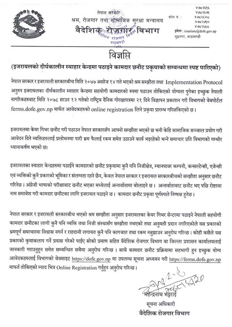 सरकारले इजरायलमा रोजगारीका लागि पठाउन अनलाइन विज्ञापन प्रकाशन गरिसकेको सन्दर्भमा केही व्यक्तिहरुले सामाजिक सञ्जाल प्रयोग गरी आवेदन दिने व्यक्तिहरुलाई प्रलोभनमा पारी भ्रम फैलाई रकम उठाउने कार्यभैरहेको भन्दै विभागले विज्ञप्तीमार्फत सजग रहन आग्रह गरेको हो ।