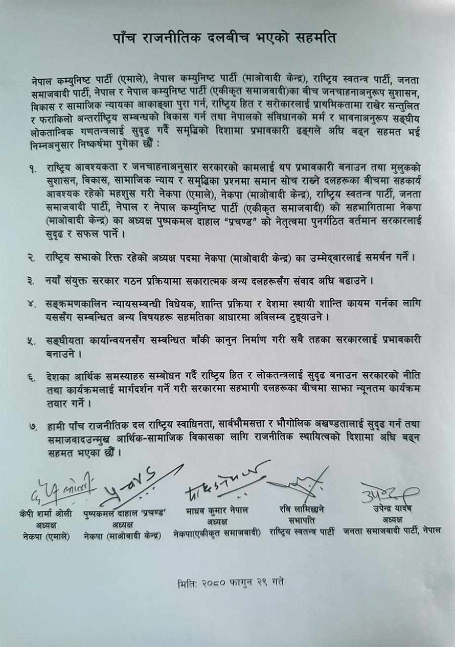 त्यो लिखित सहमतिमा माधवकुमार नेपाल नेतृत्वको एकीकृत समाजवादी समावेश थिएन । तर मंगलबार एकीकृत समाजवादी समेत थपिएर पाँच दलबीच ७ बुँदे सहमतिपत्रमा हस्ताक्षर भएको छ ।
