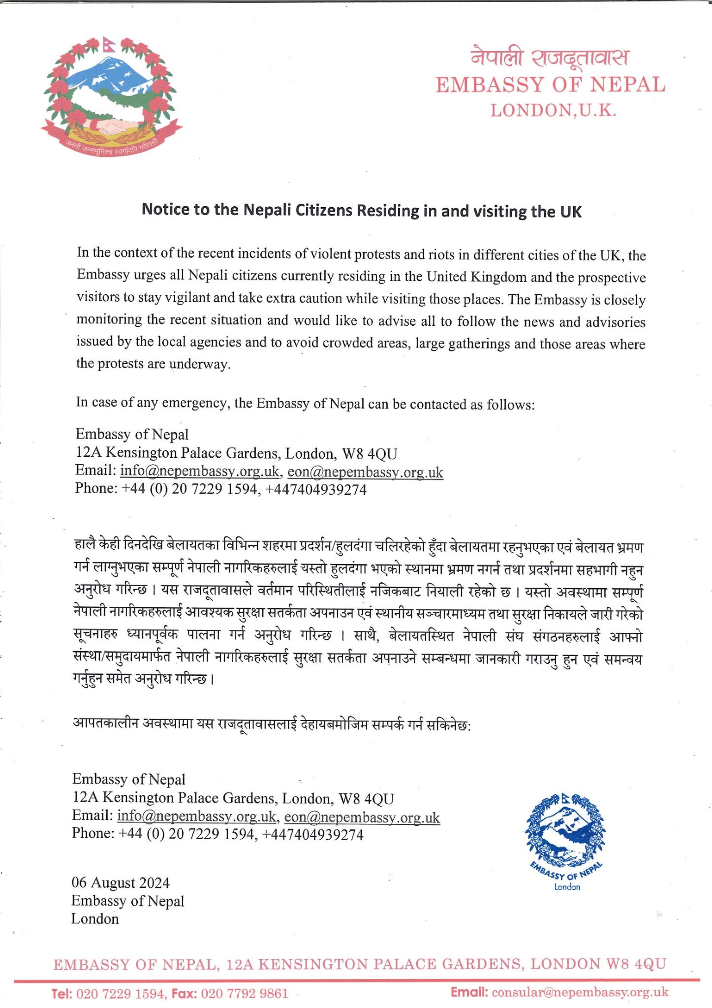 दूतावासले मंगलबार एक अपील जारी गर्दै बेलायतमा रहेका एवं बेलायत भ्रमण गर्न लागेका सबै नेपाली नागरिकलाई हुलदंगा भएको स्थानमा भ्रमण नगर्न तथा प्रदर्शनमा सहभागी नहुन अनुरोध गरेको हो ।