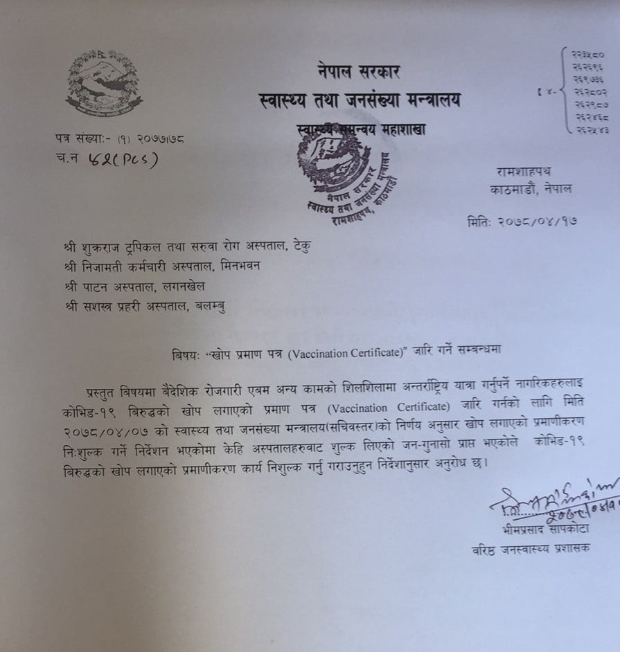 वैदेशिक रोजगारी, अध्ययन लगायत अरु काममा विदेश जानेहरुलाई खोप लगाएको प्रमाणीकरण निःशुल्क गराउन स्वास्थ्य तथा जनसंख्या मन्त्रालयले सम्बन्धित अस्पताललाई निर्देशन दिएको छ ।