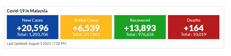 मलेसियामा आज २० हजार ५सय ९६ जना नयाँ कोरोना सक्रमित थपिएका छन । यो सगै मलेसियामा कोरोना सक्रमित हुनेको सख्या १२ लाख ३ हजार ७ सय ६ जना पुगेको छ ।