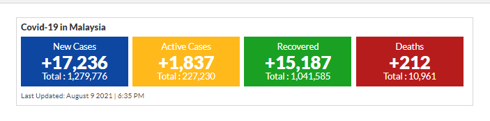 मलेसियामा आज १७ हजार २सय ३६ जना नयाँ कोरोना सक्रमित थपिएका छन । योसँगै संक्रमण हुनेको संख्या १२लाख ७९ हजार ७सय ७६ पुगेको छ । यस्तै पछिल्लो २४ घण्टामा २ सय १२ जनाको मृत्यु भएको छ भने हाल सम्म मृत्यु हुनेको संख्या १० हजार ९ सय ६१ जना पुगेको छ