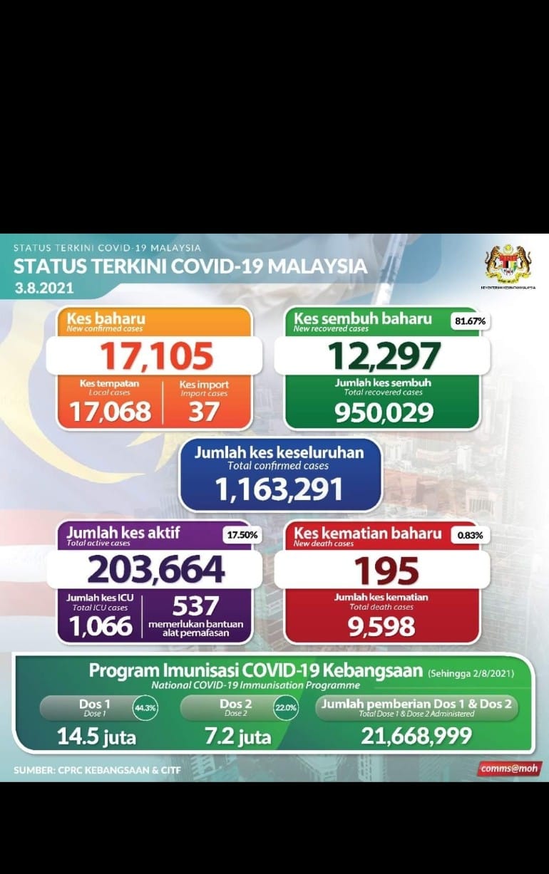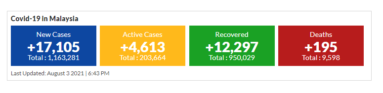 मलेसियामा अहिले २ लाख ३ हजार ६सय ६४ जना सक्रिय सक्रमित रहेका छन जसमध्ये ४ हजार ६ सय१३ जनाको अवस्था गंभिर रहेको छ । उनीहरुको मलेसियाको विभिन्न अस्पतालहरुमा उपचार भैरहेको छ ।