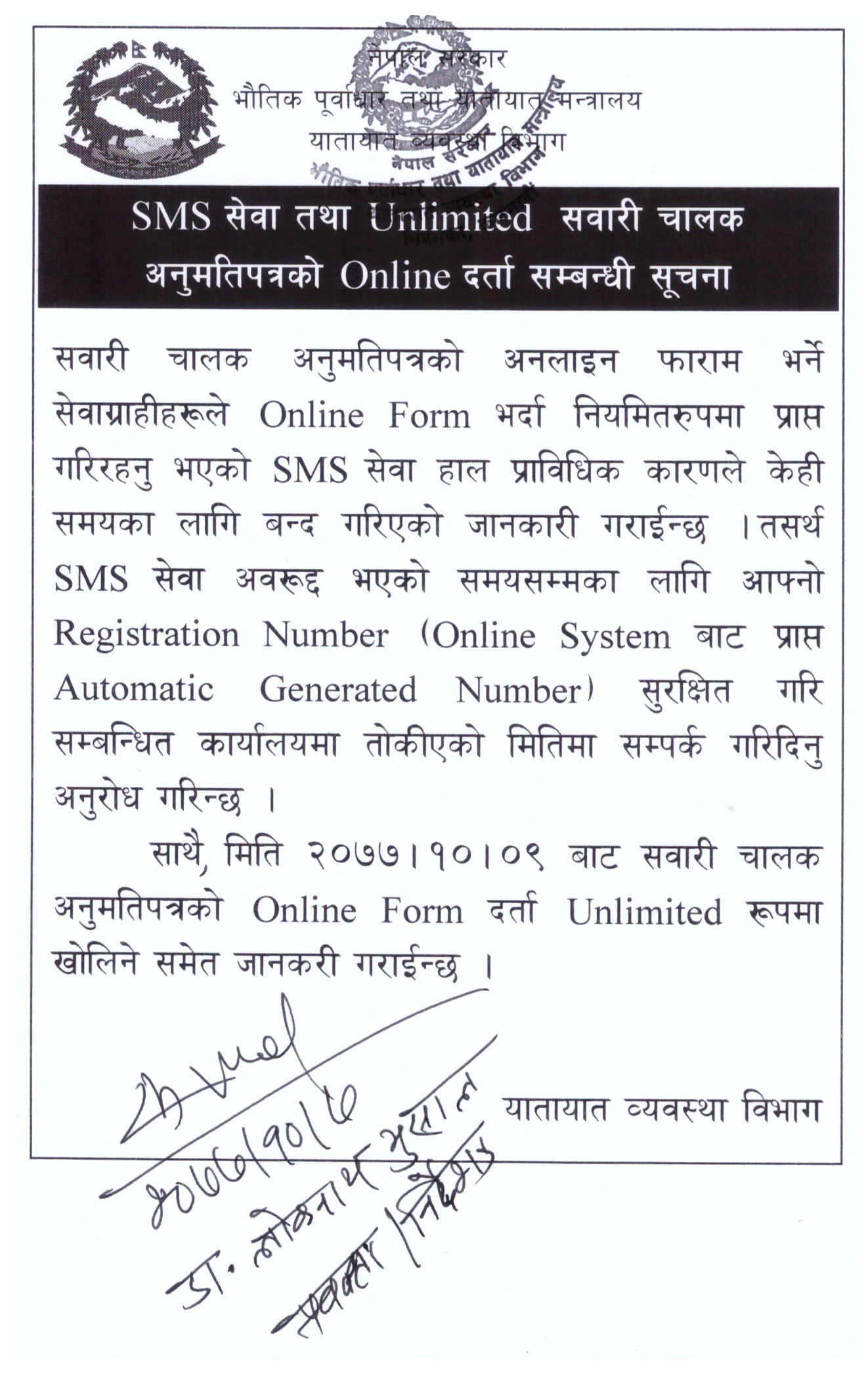 एसएमएस सेवा बन्द रहेको अवस्थामा रजिस्ट्रेसन नम्बरसहित तोकिएको समयमा कार्यालयमा सम्पर्क गर्नुपर्ने प्रवक्ता भुसालले बताउनुभयो ।