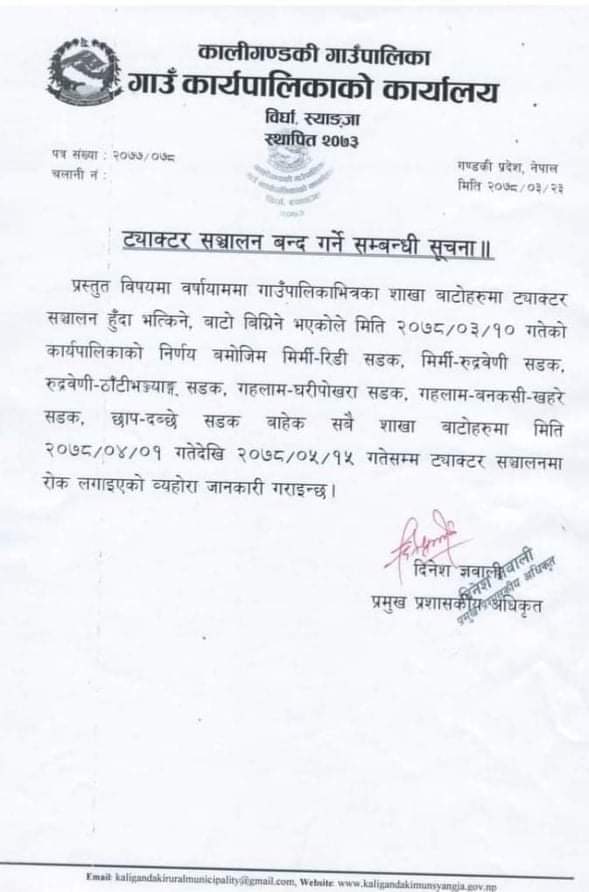 काली गण्डकी गाउँ पालिका स्याङ्जा ले विभिन्न कच्ची सडकहरुमा टयाक्टर चल्नको लागि रोक लगाएको छ ।