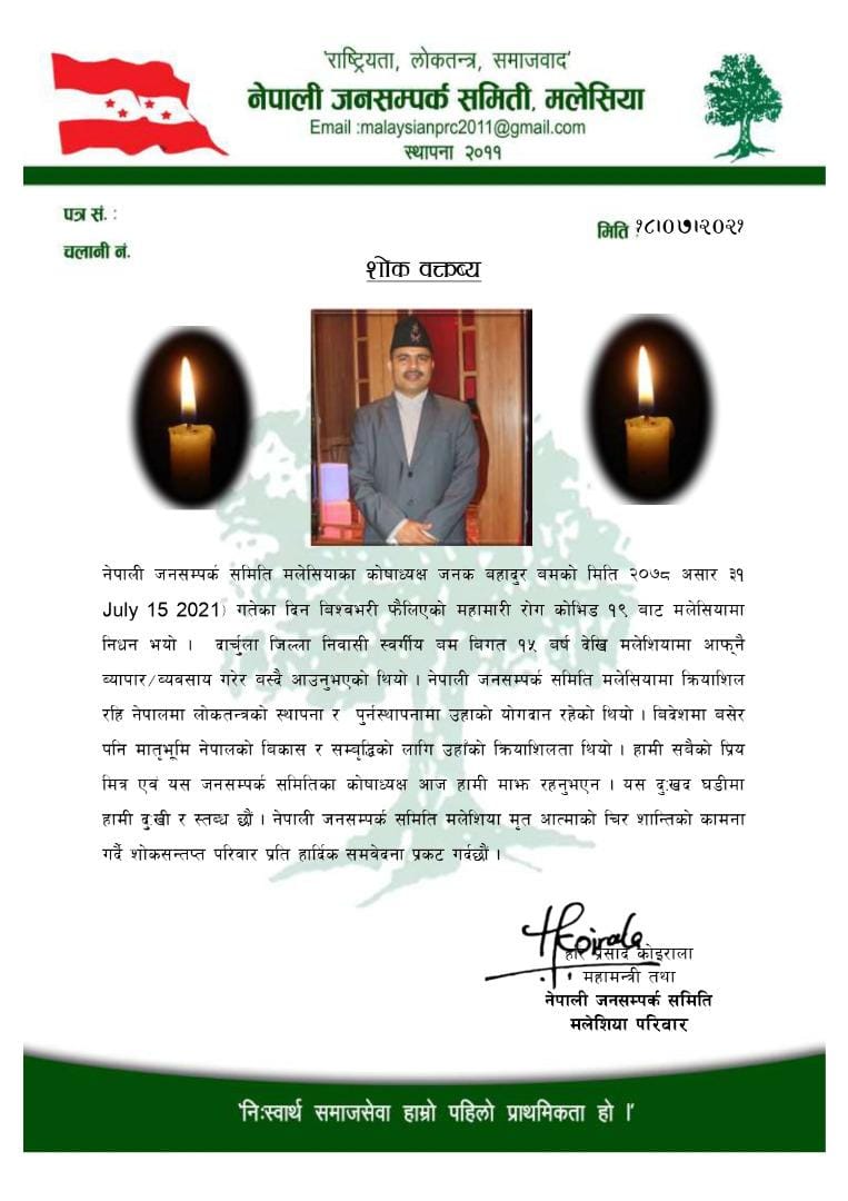 नेपाली जनसम्पर्क समिती मलेसियाले आज शोक वक्तब्य जारी गर्दे जनक वमको मृत्युलाई परिवार, समाज तथा मलेसियाको जनसम्पर्क समितिलाई समेत अपुरणिय क्षती पुगेको जनाएको छ ।