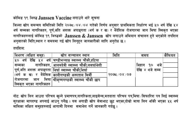 कालिगण्डकी गाउँपालिकामा आउदो सात गते कोरोना विरुद्धको खोप(जोन्सन खोप) लगाईने भएको छ । ५० वर्ष  देखि ५४ वर्ष उमेर सम्मका पूर्ण अति अशक्त अपागंता (वर्ग क,ख) र वैदेशिक रोजगारमा जान भिषा स्विकृत भएका नागरीकहलाई खोप दिन थालिएको  हो ।