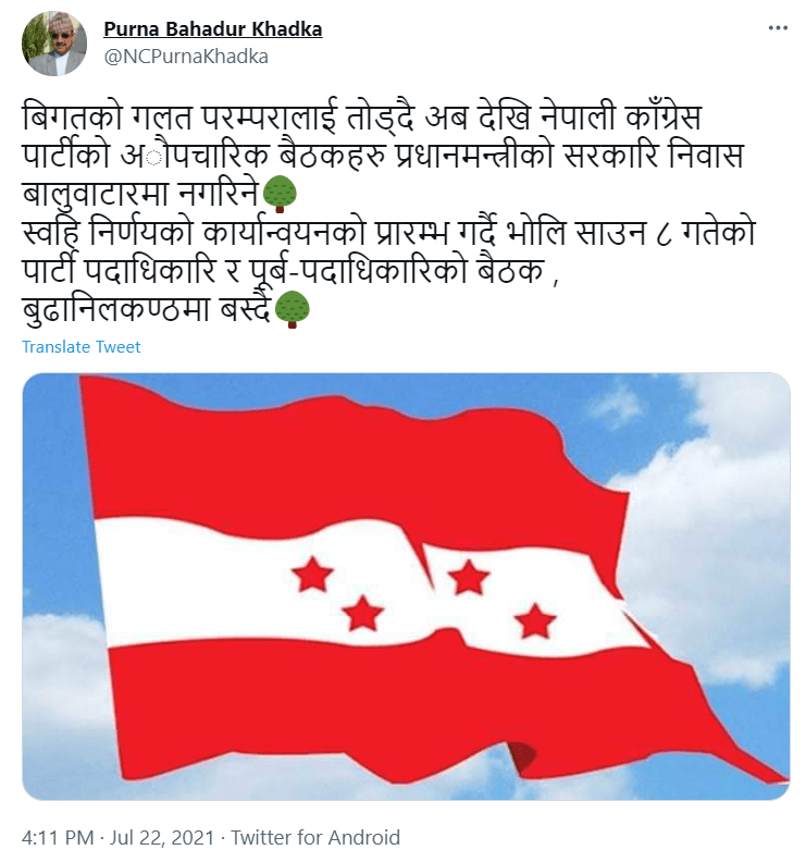 महामन्त्री पूर्ण बहादुर खड्काले विगतको गलत परम्परालाई तोड्दै अबदेखि नेपाली कांग्रेसको औपचारिक बैठकहरु प्रधानमन्त्रीको सरकारी निवास बालुवाटारमा नगरिने जानकारी दिएका हुन् ।