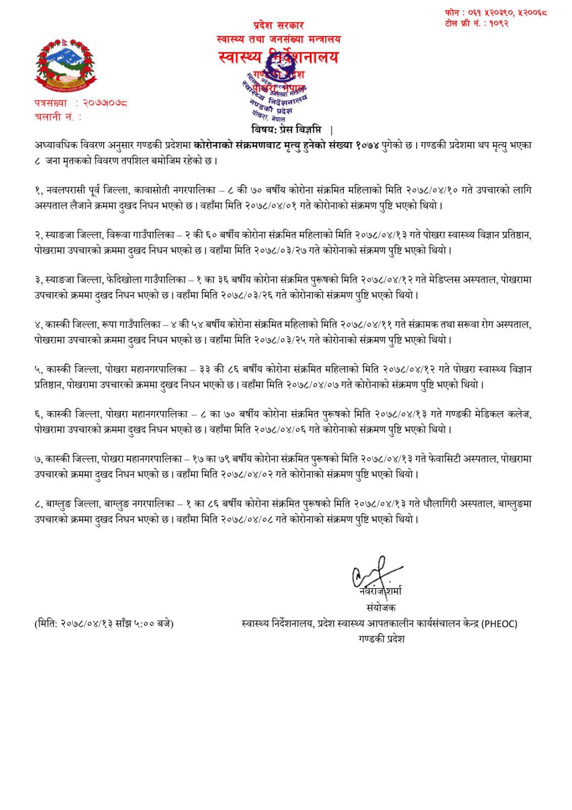 असार २७ गते कोराना सक्रमण देखिएकि विरुवा कि महिलाको पोखरा स्वास्थ विज्ञान प्रतिस्ठानमा उपचारको कैममा मृत्यु भएको हो ।