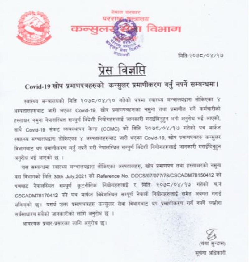 अबदेखि कन्सुलर सेवा विभागमा खोप लगाएको भनेर प्रमाणीकरण गर्नु नपर्ने भएको छ ।