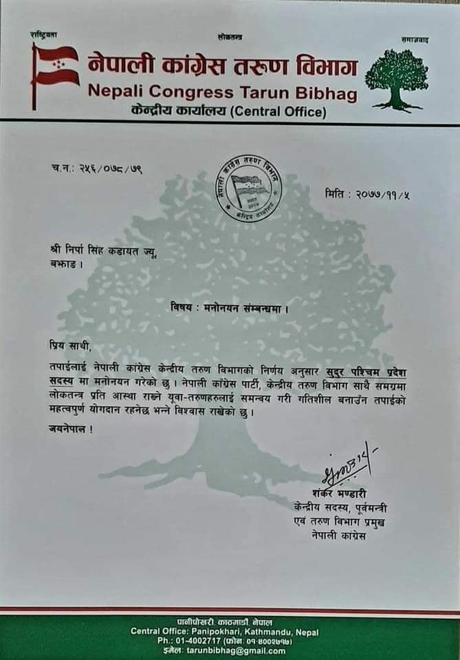 नेपाली काङ्ग्रेस केन्द्रिय तरुण बिभागले तरुण दलको सुदूरपश्चिम प्रदेश सदस्यमा बझाङका नृपसिंह कडायतला मनोनित गरेको हो ।