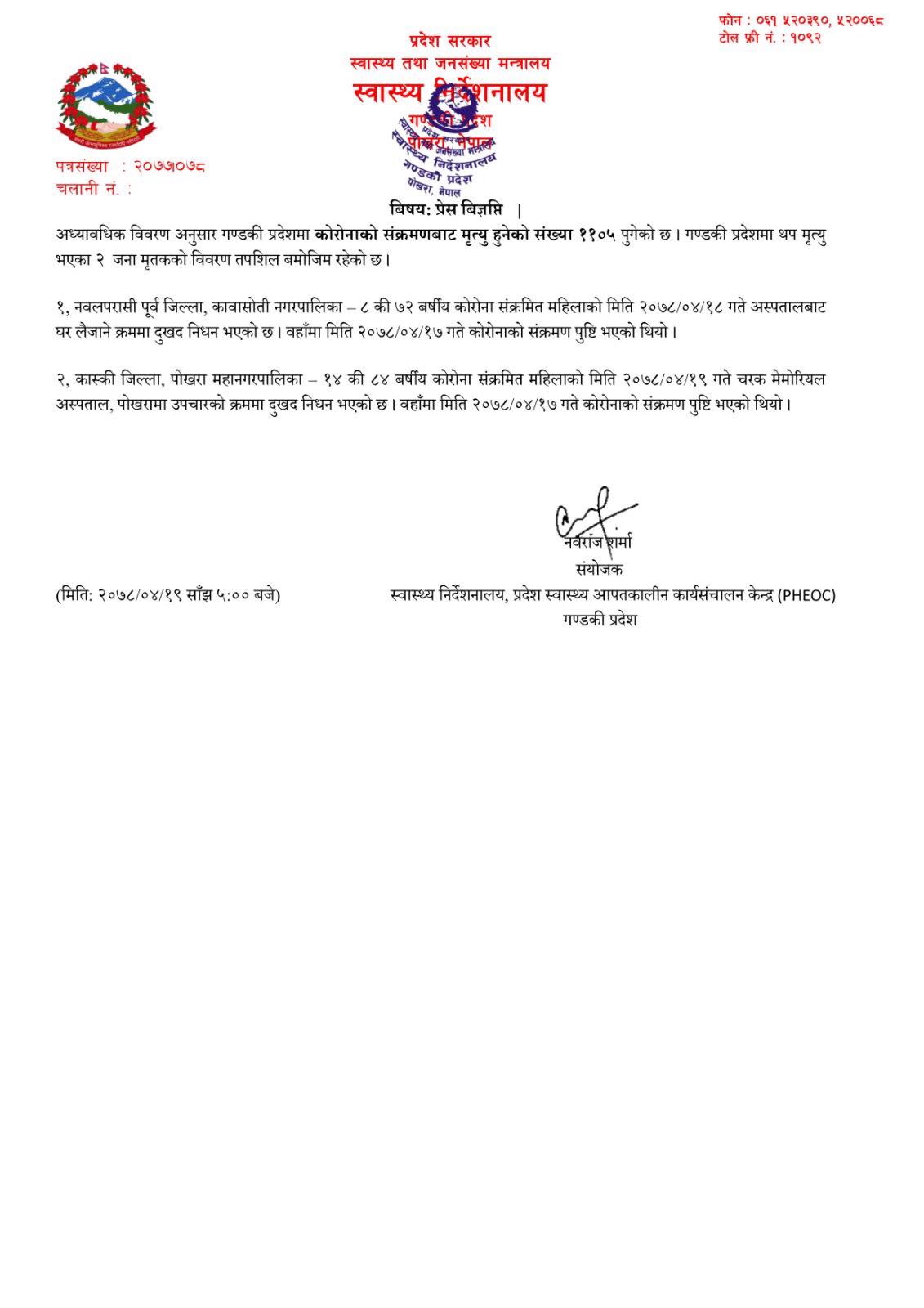 प्रदेश स्वास्थ्य निर्देशनालयका अनुसार कास्कीमा१५५ जना, तनहुँमा ६१ जना, गोरखामा ८४ जना, लमजुङमा ११ जना र नवलपुरमा ४४ जनामा कोरोना पुष्टि भएको छ ।