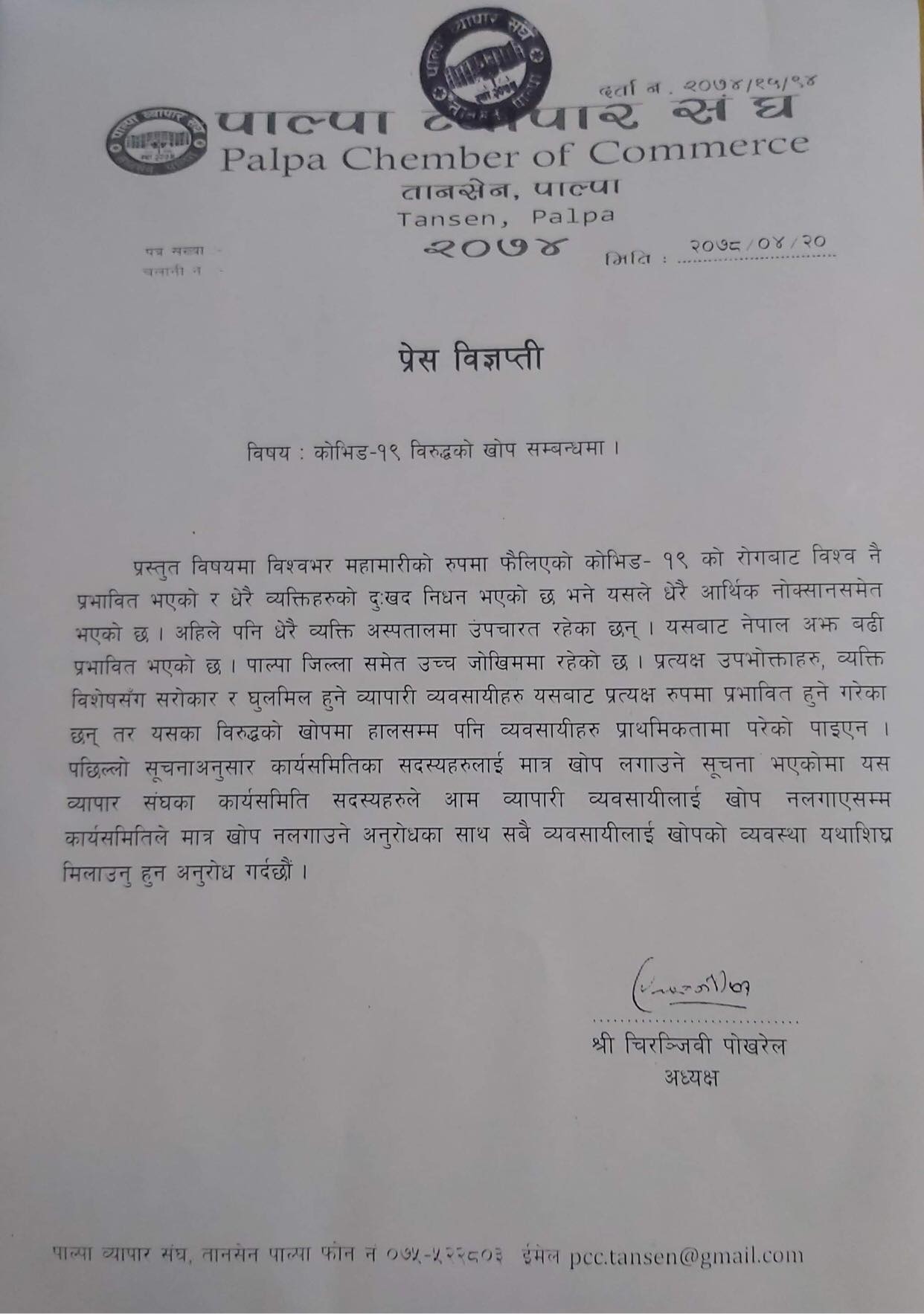 पाल्पा ब्यापार संघका अध्यक्ष चिरिन्जीवि पोखरेलले जारी गरेको प्रेस विज्ञप्तीमा भनिएको छ -पछिल्लो सुचना अनुसार कार्यसमितिका सदस्यहरुलाई मात्र खोप लगाउने सुचना भएकोमा ब्यापार संघ कार्यसमितिका सदस्यहरुले आम ब्यवसायिलाई खोप नलगाए सम्म कार्यसमितिले मात्र खोप नलगाउने अनुरोध गर्दै सवै ब्यवसायिलाई खोपको ब्यवस्था यथासिघ्र मिलाउन अनुरोध गर्दछौ ।