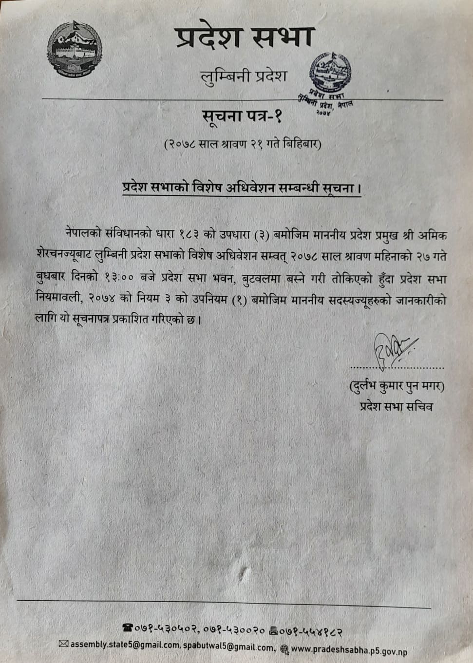प्रदेशसभा सचिवालयले बिहीवार सूचना जारी गर्दै प्रदेश प्रमुख अमिक शेरचनबाट साउन २७ गतेका लागि विशेष अधिवेशन आह्वान भएको जनाएको छ ।