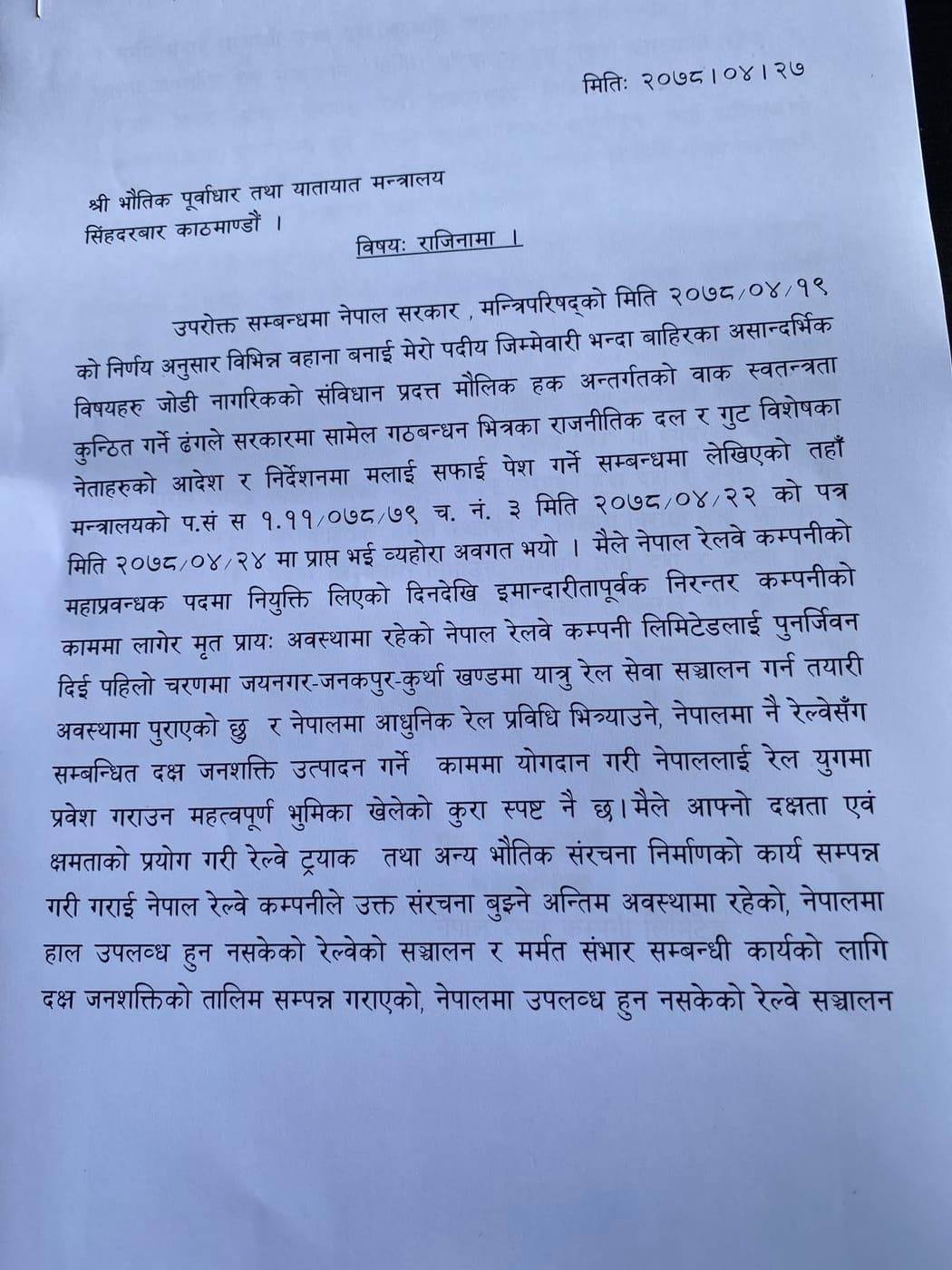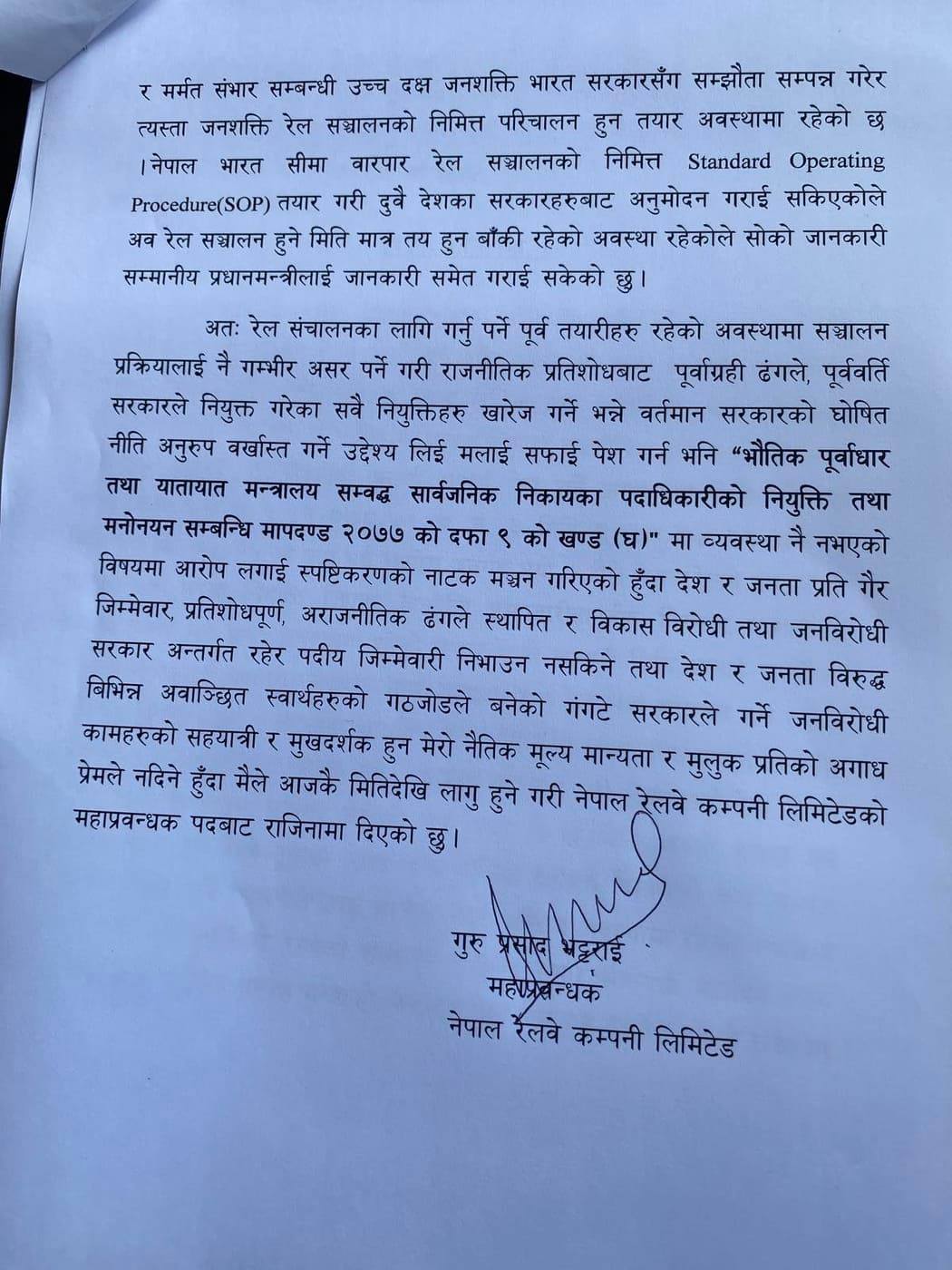 नेपाल रेल्वे कम्पनी लिमिटेडका महाप्रबन्धक गुरुप्रसाद भट्टराईले पदबाट राजीनामा दिएका छन् ।