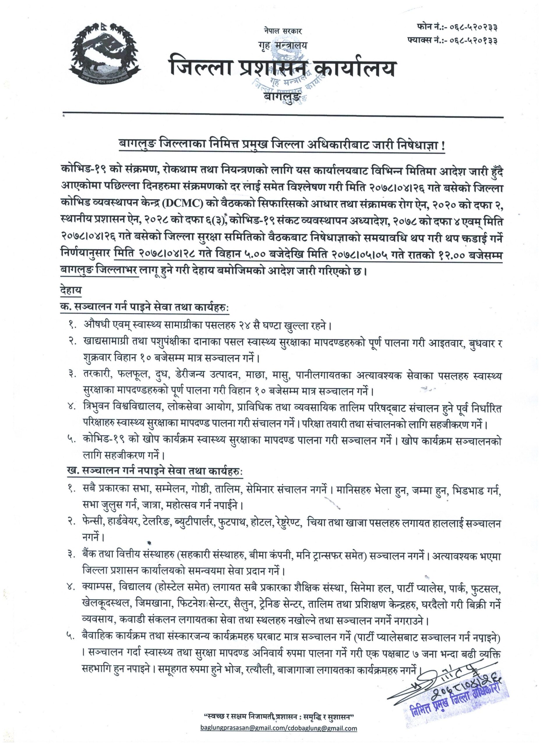 कारोना संक्रमण दर बढ्दै जान थालेपछी बागलुङमा जारी निषेधाज्ञालाई थप कडाई गरिएको छ ।