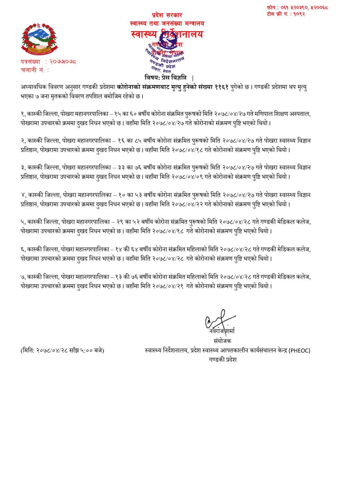 बिहीबार गण्डकीमा थप सात जनाको मृत्यु पुष्टि भएको छ । आज मृत्यु पुष्टि हुनेमा सातै जना पोखरा महानगरपालिकाका विभिन्न वडाका छन्।