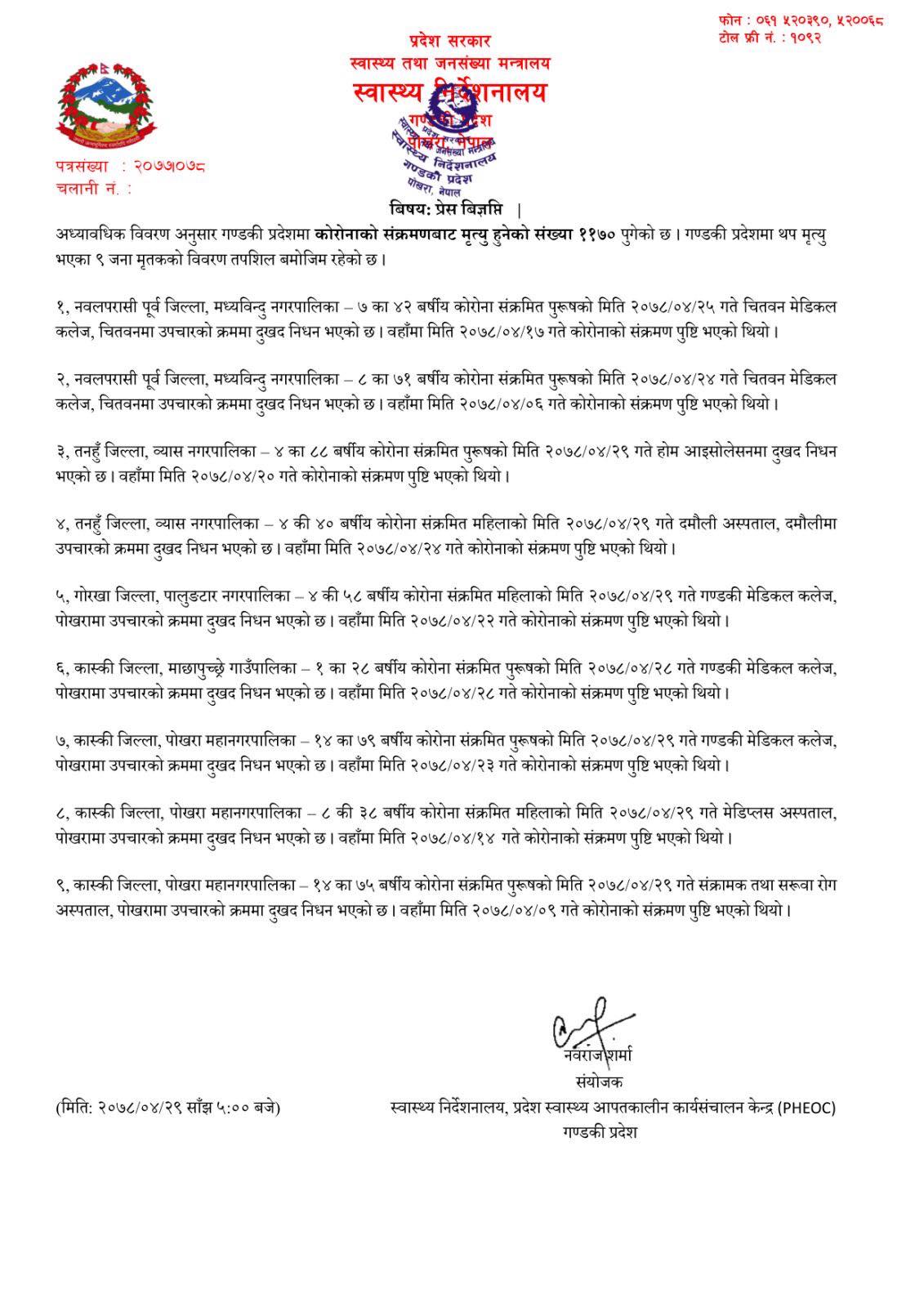 आज मृत्यु पुष्टि हुनेमा नवलपुरका दुई जना, तनहुँका दुई जना, गोरखाका एक जना र कास्कीका चार जना रहेका छन् ।