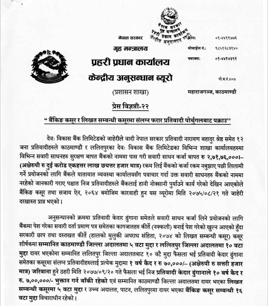 पक्राउ पर्नेमा काभ्रे जिल्ला भुम्लु गाउँपालिका(१ का ४३ वर्षका केदार ढुंगाना रहेको प्रहरीको केन्द्रीय अनुसन्धान व्यूरोले जनाएको छ ।