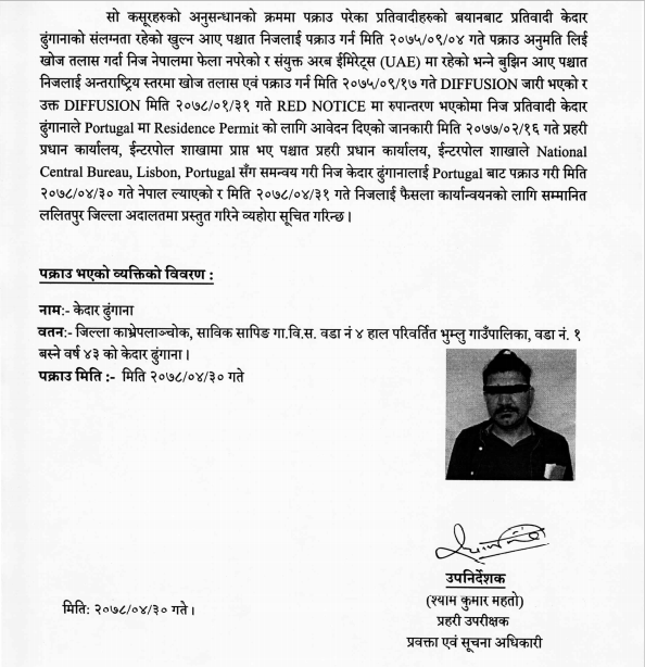 मुख्य आरोपी ढुंगाना विदेशमा रहेको जानकारी पाएपछि प्रहरीले २०७५ पुस १७ गते इन्टरपोलमार्फत डिफ्युजन नोटिस जारी गरेको थियो ।