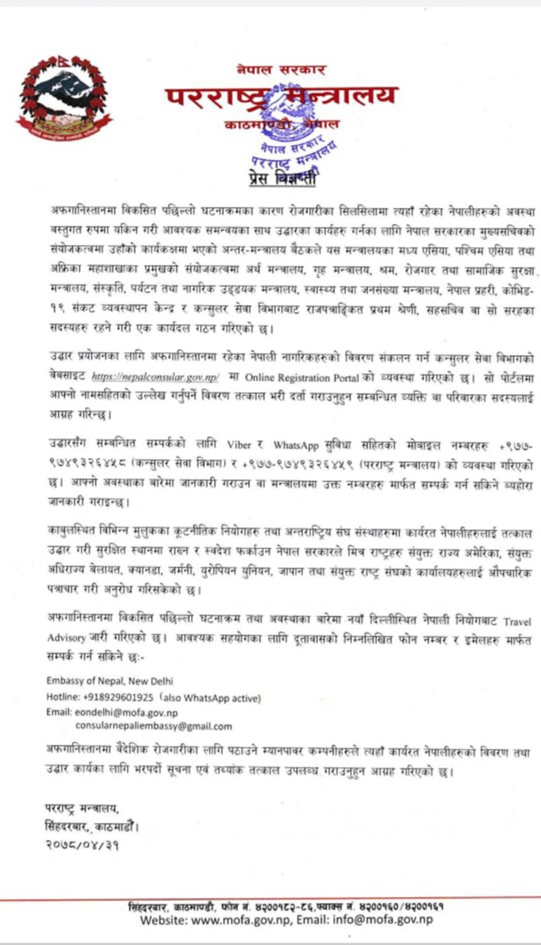 अफगानिस्तानमा विकसित पछिल्लो घटनाक्रम तथा अवस्थाका बारेमा नयाँ दिल्लीस्थित नेपाली नियोगबाट Travel Advisory जारी गरिएको छ। आवश्यक सहयोगका लागि दूतावासको निम्नलिखित फोन नम्बर र इमेलहरु मार्फत सम्पर्क गर्न सकिने छः-