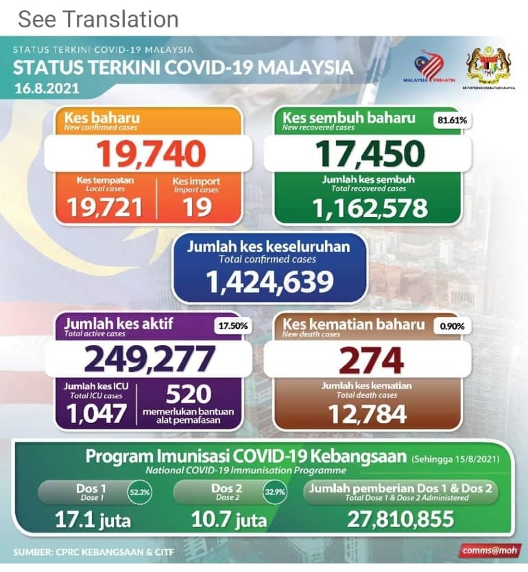 मलेसियामा आज १९हजार ७४० जना कोरोना सक्रमित थपिएका छन ।