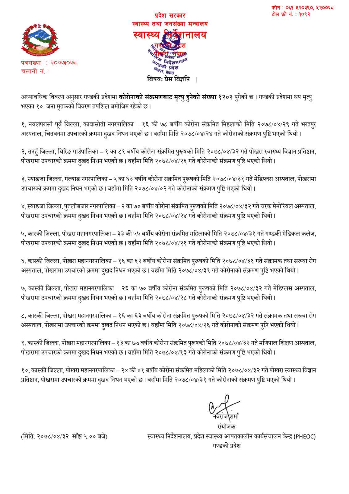 यसैगरी स्याङ्गजाकापुतलीवजार २ का ७० वर्षिय पुरुषको आज मृत्यु भएको हो ।
