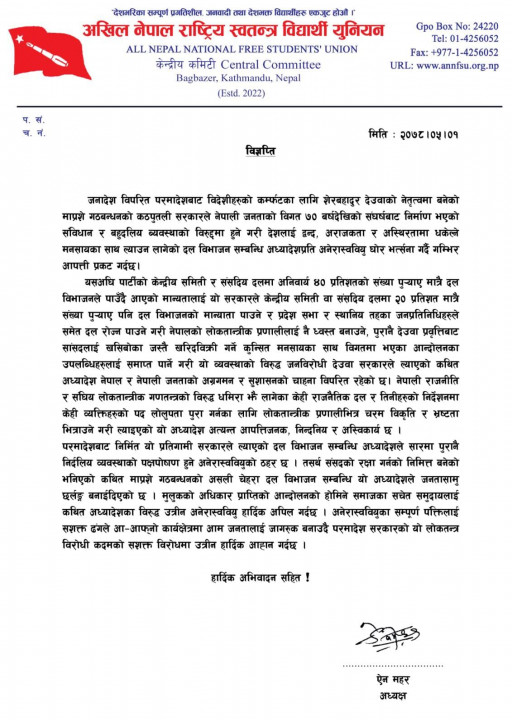 नेकपा एमाले निकट अखिल नेपाल स्वतन्त्र विद्यार्थी युनियन (अनेरास्ववियू)ले सरकारको सिफारिसमा राष्ट्रपतिले जारी गरेको दल विभाजन अध्यादेशको विरुद्धमा आन्दोलनमा उत्रन आह्वान गरेको छ ।