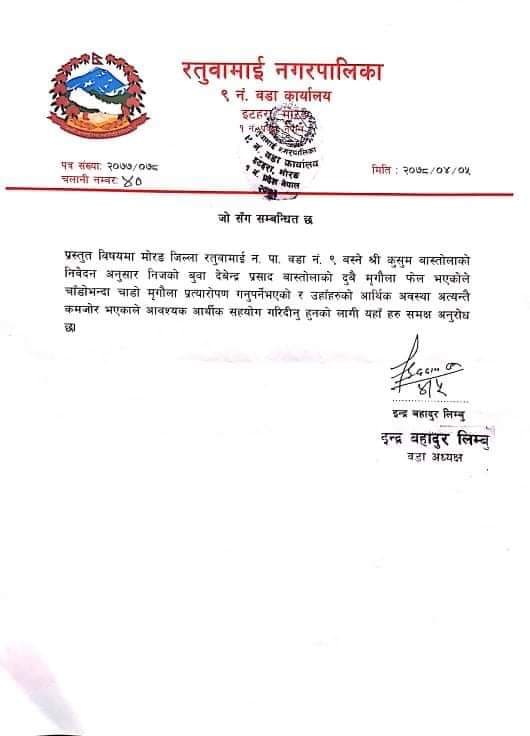 दुवै मृगौला फेल भएर उपचार गराईरहेका मोरङका रतुवामाइ नगरपालिका वडा नं ९ का देबेन्द्र प्रसाद बस्तोलालाइ मलेसियावाट सहयोग गरिएको छ ।