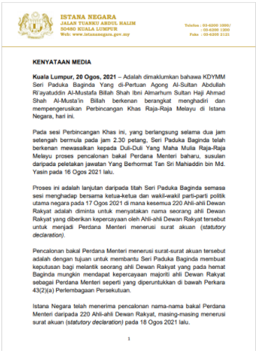मलेसियाको राजदरबारले जारी गरेको विज्ञप्तिअनुसार २२२ मध्ये ११४ जना सासंदले याकोबलाई समर्थन गरेका छन्।