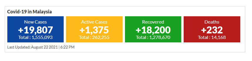आज २३२ जनाको सक्रमणवाट मृत्यु भएको छ । आज मृत्यु भएका सगै मलेसियामा कोरोना सक्रमणवाट मृत्यु हुनेको सख्या १४हजार १६८ पुगेको छ ।