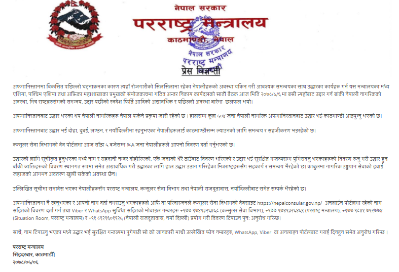 अफगानिस्तानमा तालिवान समूहले सत्ता कव्जा गरेसँगै अलपत्रमा परेका ८६० जना नेपाली सम्पर्कमा आएको परराष्ट्र मन्त्रालयले जनाएको छ । आइतबार साँझसम्मको तथ्याङकमा उद्धार भई आएका ५०४ जना र बाँकी ३५६ जना सम्पर्कमा आएको मन्त्रालयले विज्ञप्ती मार्फत जानकारी गराएको छ ।