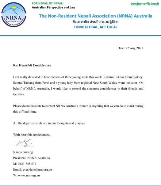 एकसाताकै अवधिमा तीन नेपालीको मृत्यु भएकोमा एनआरएनए अष्ट्रेलियाले गहिरो समवदेना ब्यक्त गरेको छ ।
