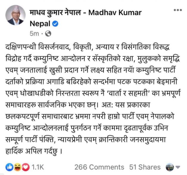 प्रस्तावित नेकपा (एकीकृत समाजवादी)का अध्यक्ष माधवकुमार नेपालले क्रान्तिकारी जनसमुदायमालाई पार्टीमा आउन अपिल गरेका छन् । सोमबार राती फेसबुकमा एक स्टाटस लेख्दै ‘वार्ता र सहमती’ जस्ता समाचारहरू भ्रमपूर्ण भएको आरोप लगाएका छन् ।